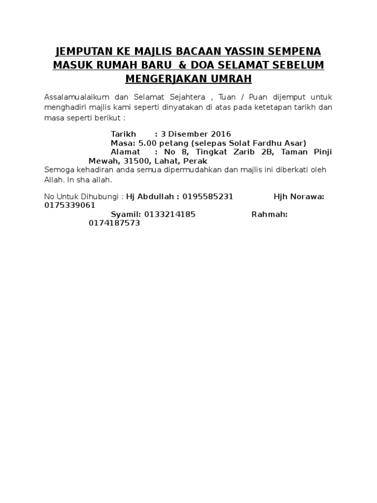 Jemputan Ke Majlis Bacaan Yassin Sempena Masuk Rumah Baru - Source